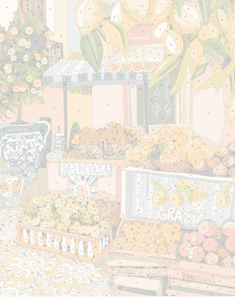 Paint by numbers kit featuring vibrant Italian market scene with lemons and colorful stalls on canvas