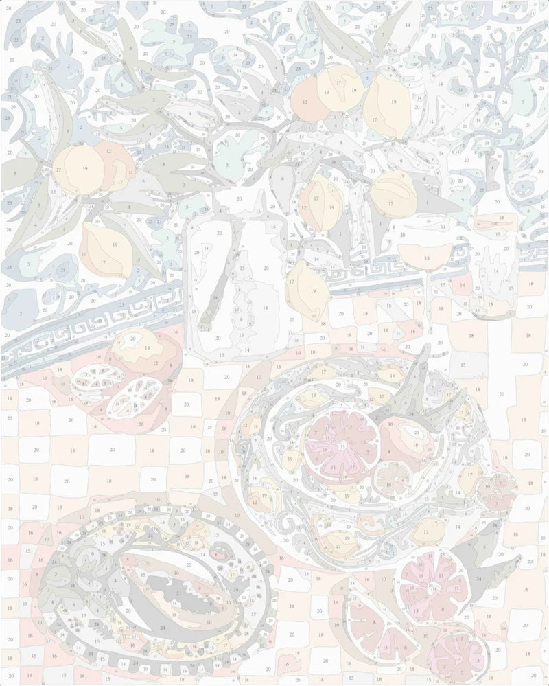 Paint by numbers kit featuring vibrant citrus fruit and patterned table setting on a 40x50cm canvas.