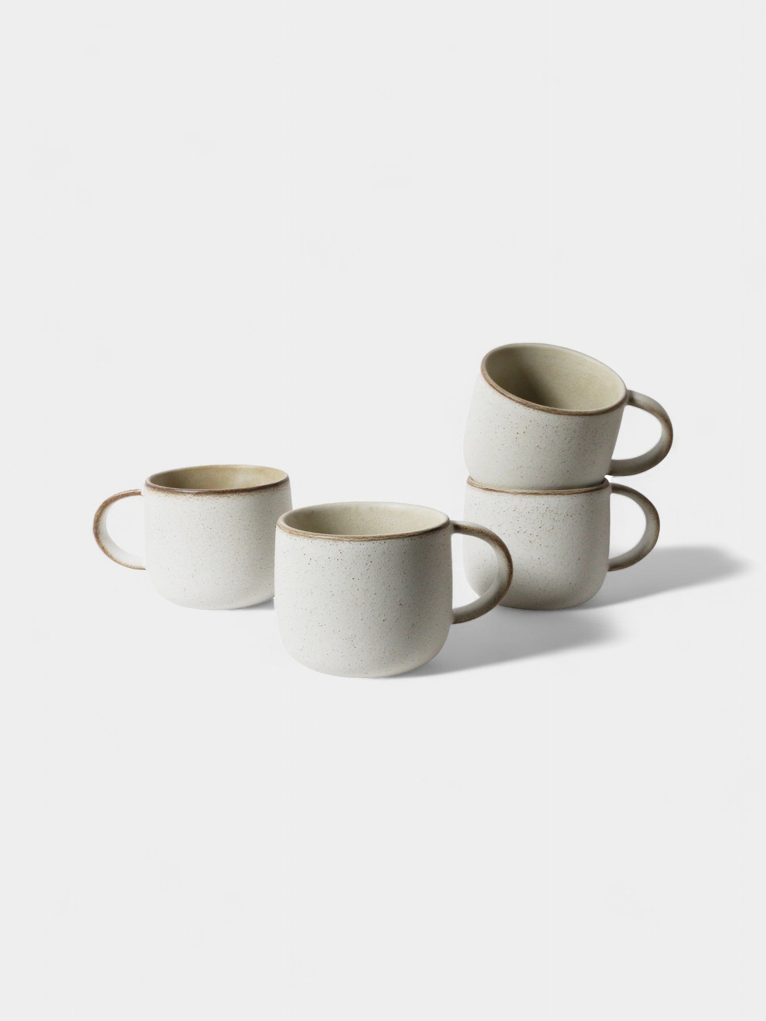 Set of four limestone mugs with a comfortable handle and speckled design for everyday use