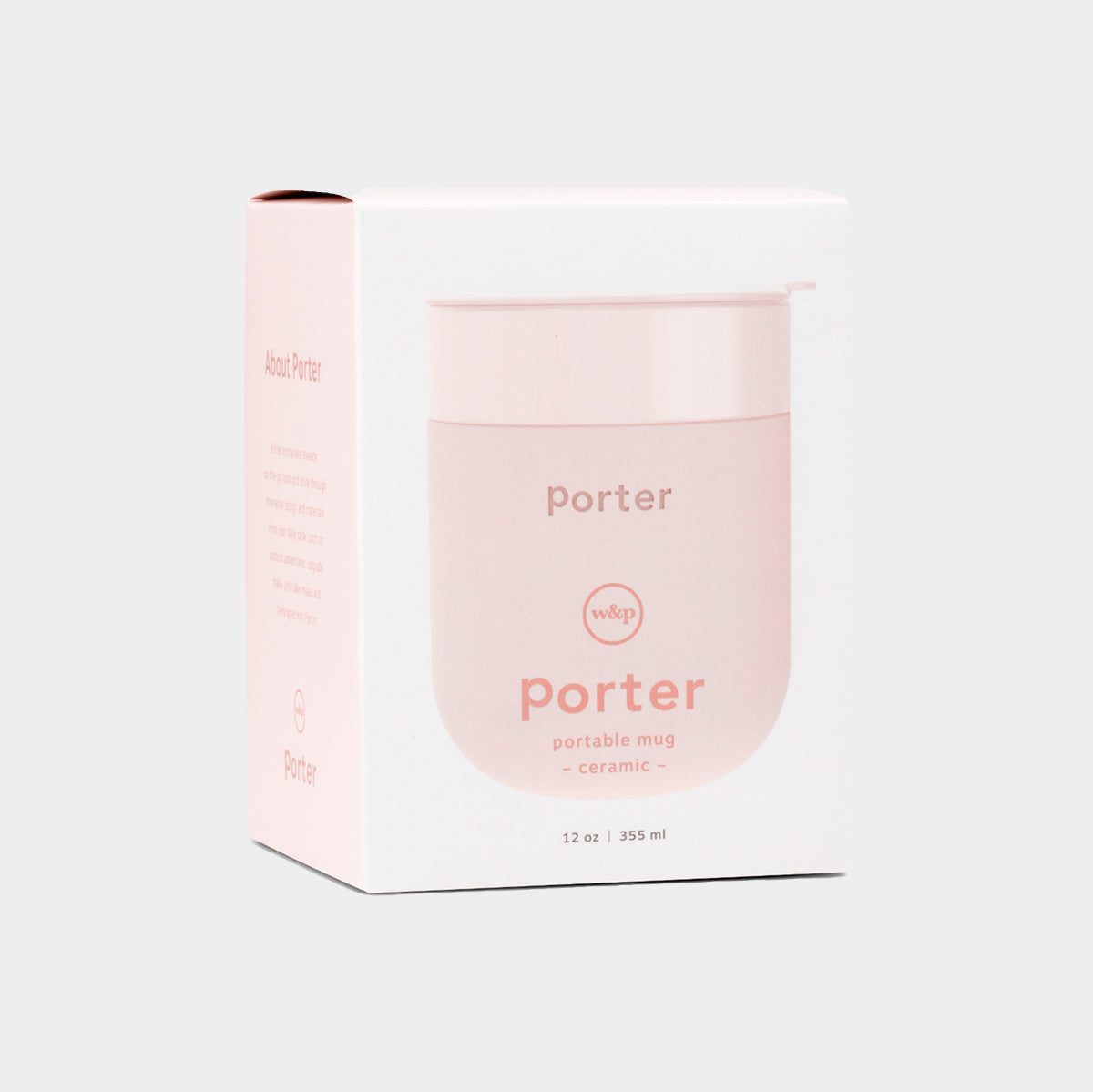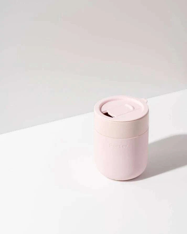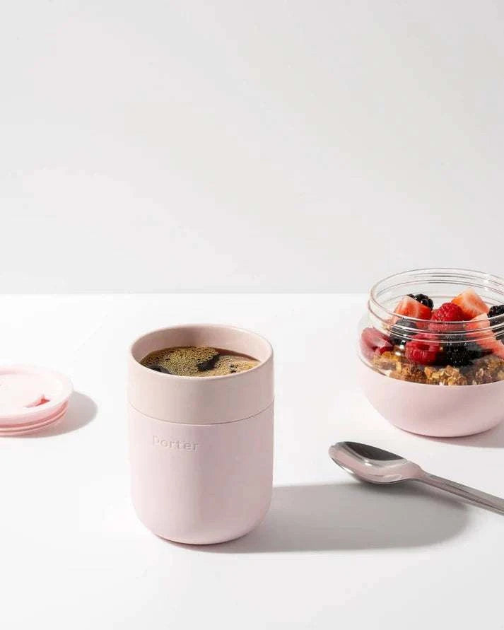 Blush ceramic travel mug with matte silicone sleeve and BPA-free press-fit lid, splash-resistant and fits most car cup holders