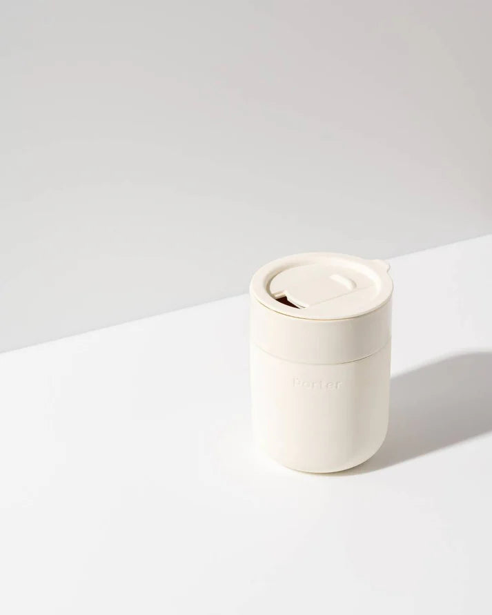 Cream ceramic travel mug with matte silicone sleeve and splash-resistant lid